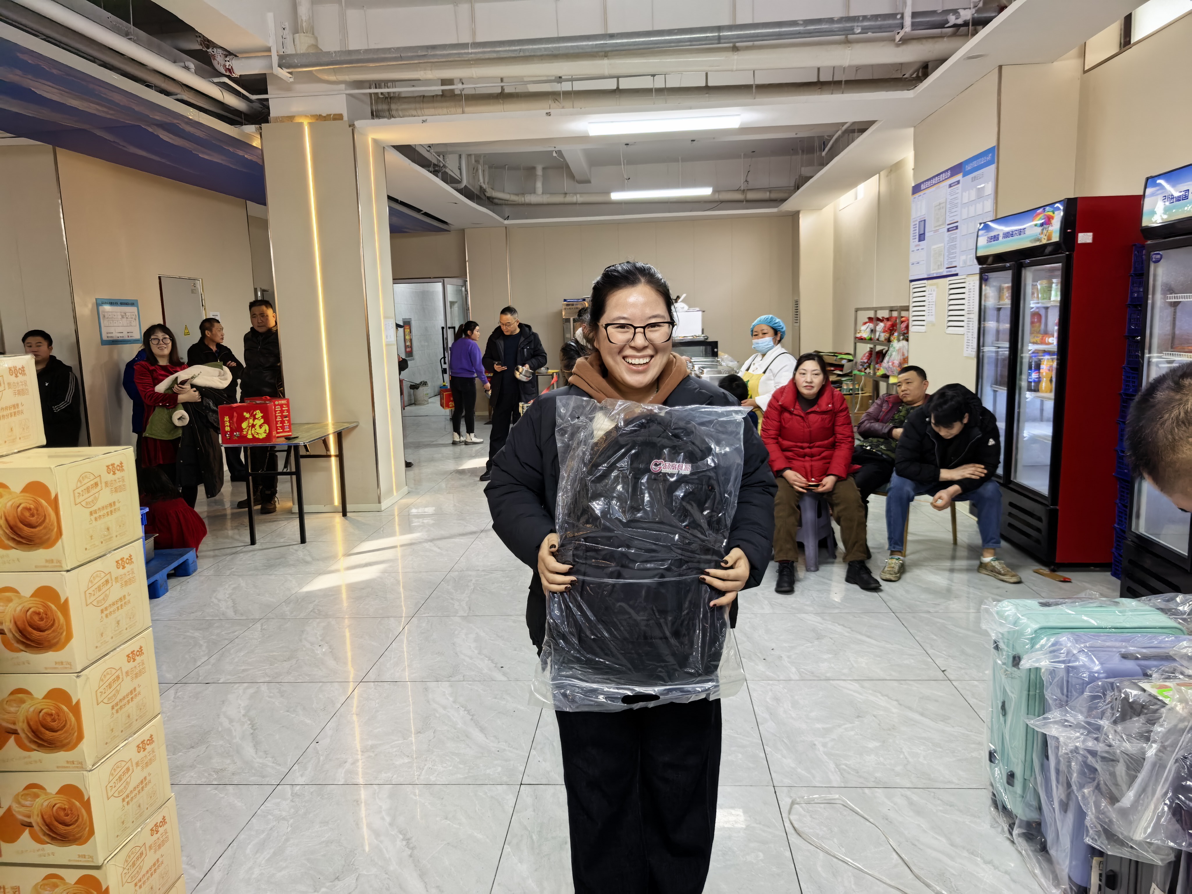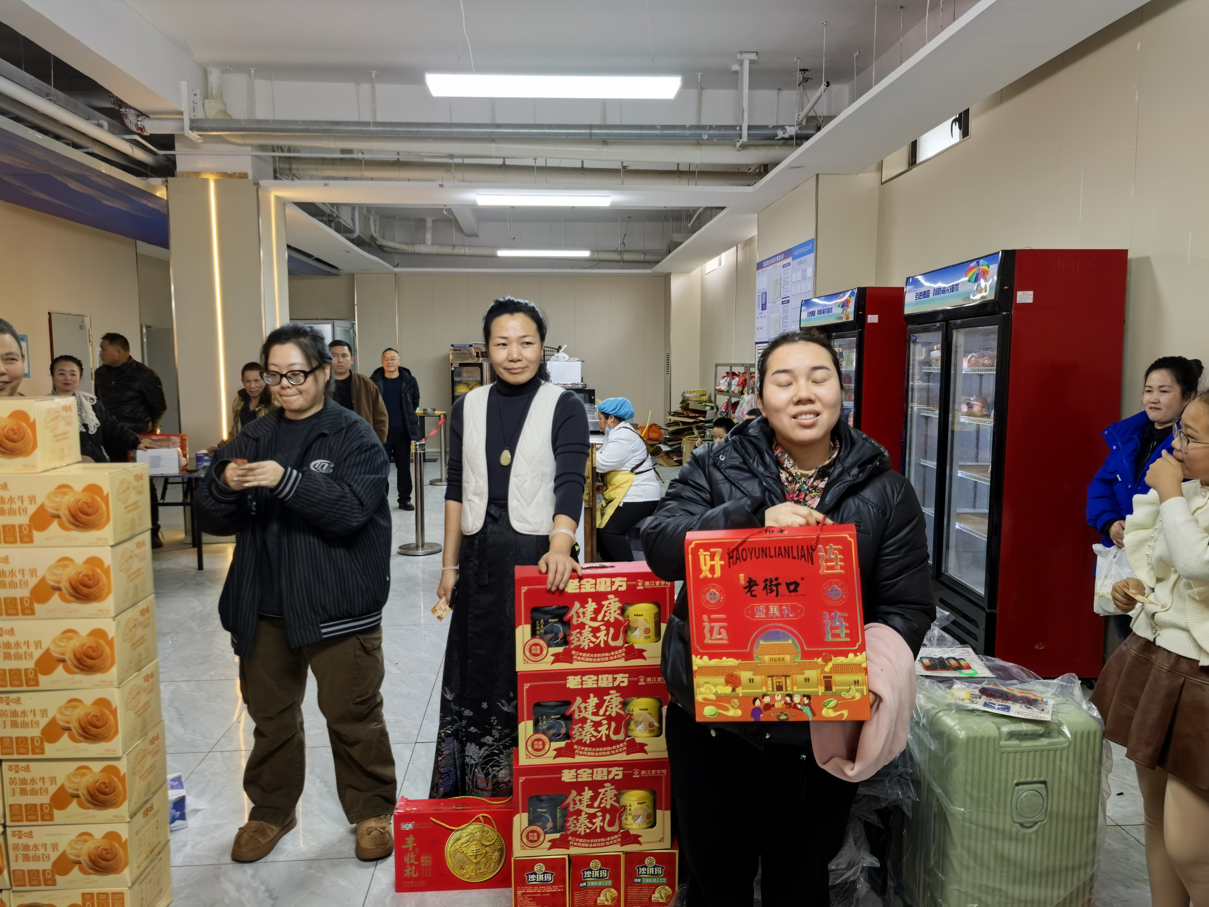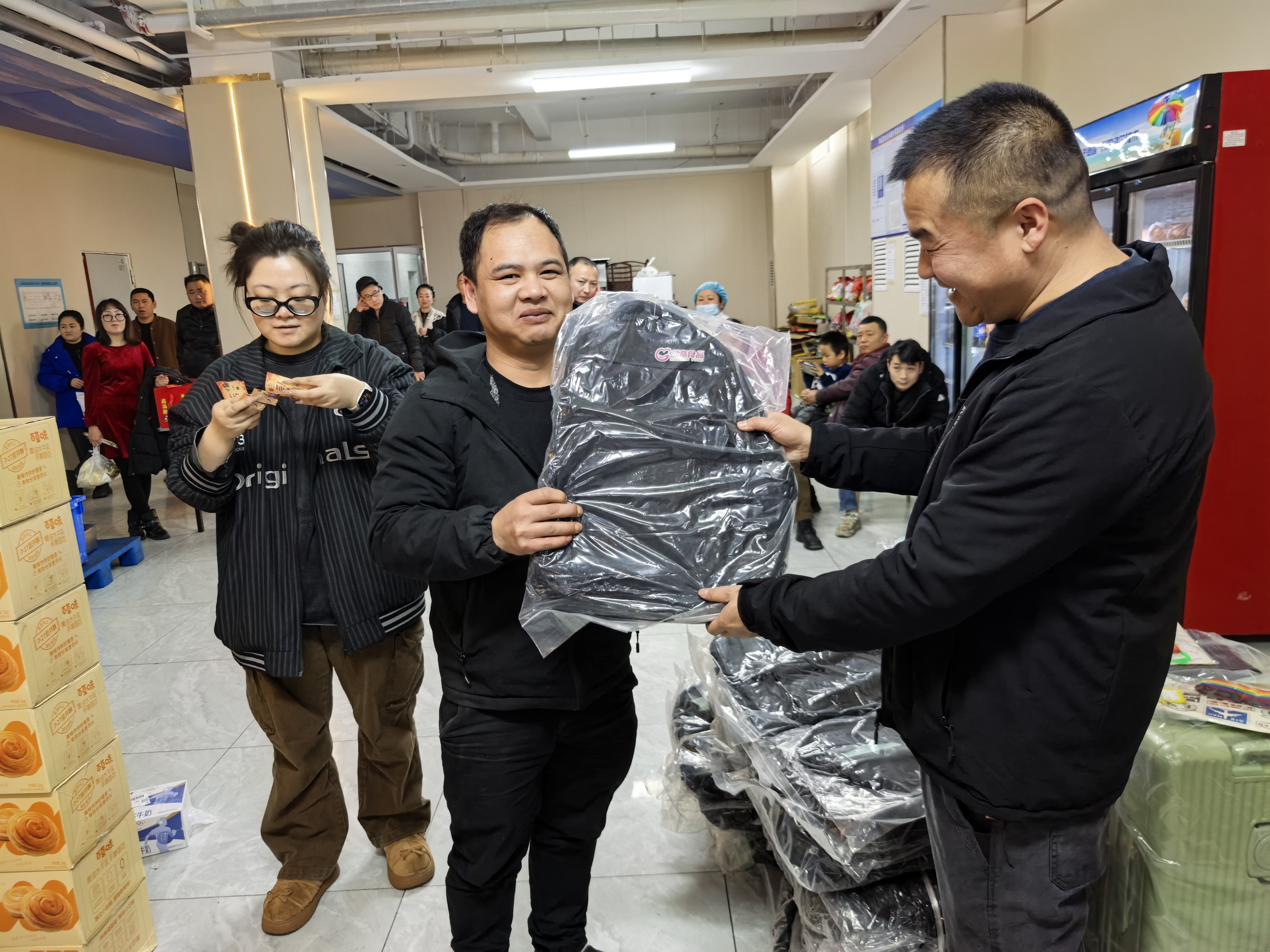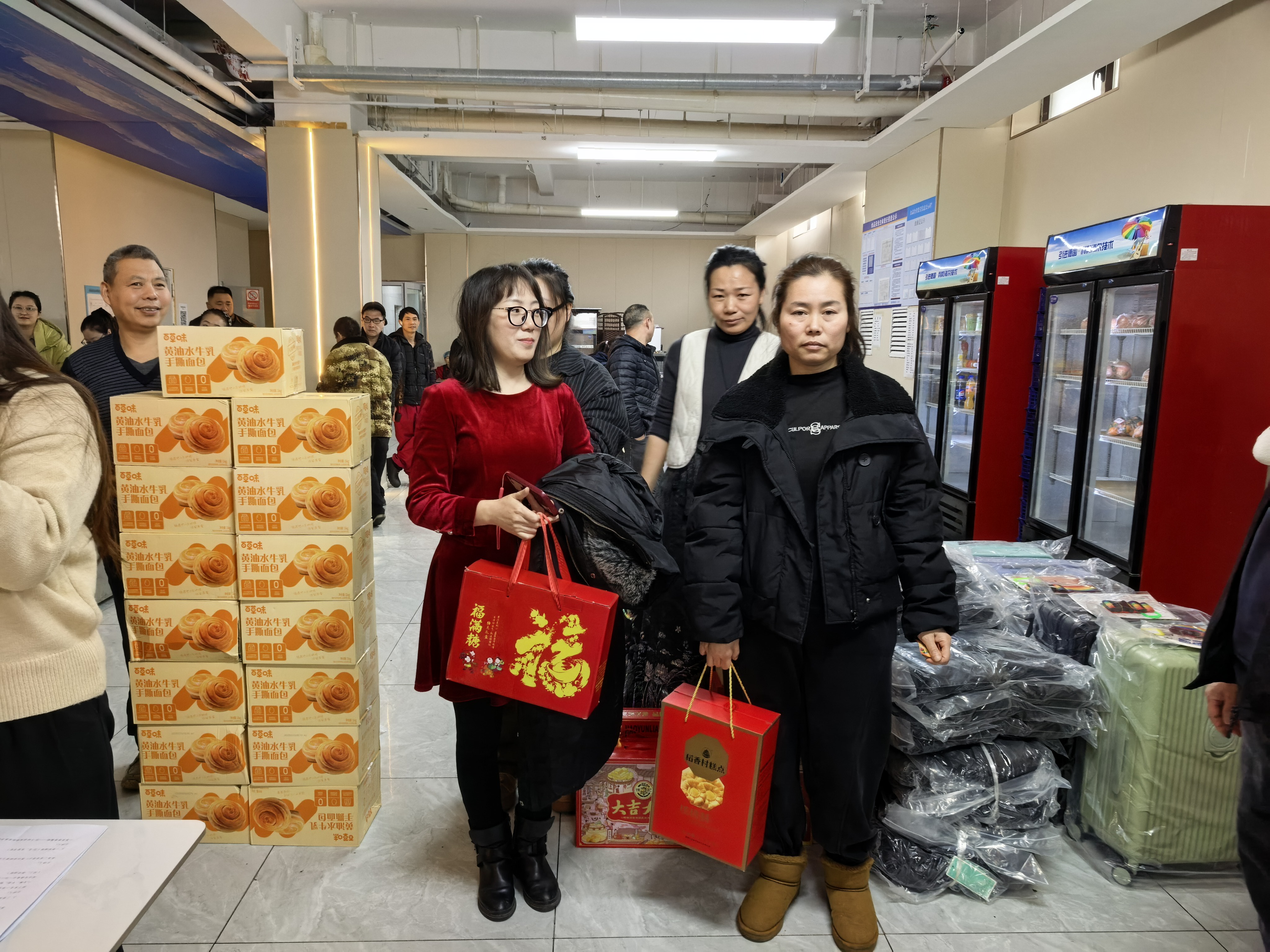 本次抽奖奖项丰厚、品类多样,覆盖全体员工,真正实现人人有礼、喜乐共享:三等奖为实用保温杯,为冬日增添温暖;二等奖为各类精选礼盒,包含美味食品与暖心好物;一等奖为时尚双肩书包,兼顾通勤与出行实用需求;特等奖为 24 寸可扩容时尚皮箱,承载美好期许与全新梦想。除此之外,未抽中奖项的员工均可领取专属手撕面包,让每一位同仁都满载而归、不虚此行。